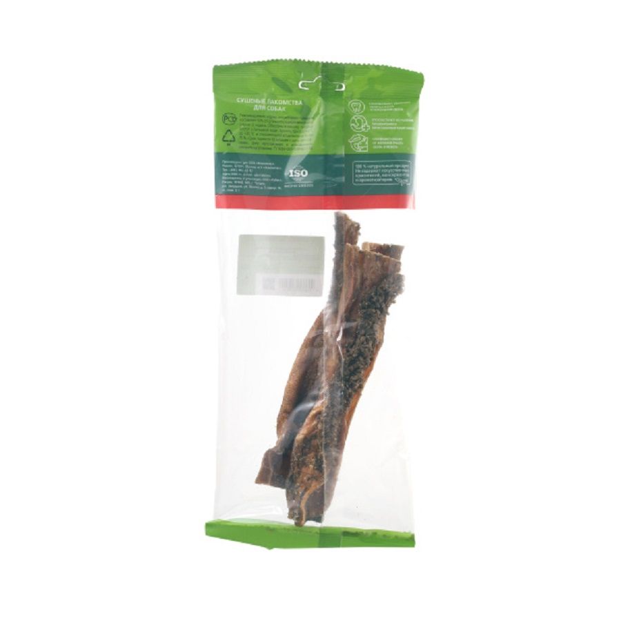 Высушенные пластины говяжьего рубца. Упаковка содержит 4-5 пластин длиной 19 см. Рубец говяжий представляет собой часть желудка КРС, точнее - первый из его преджелудков, в котором содержится полезная микрофлора. Ворсинки неочищенного сушёного рубца сохраняют на себе ферменты и витамины группы «В», вырабатываемые его микрофлорой при жизни животного. Содержат низкокалорийный, легкоусвояемый белок. Благодаря особой технологии сушки сохраняется до 60% процентов полезных веществ.