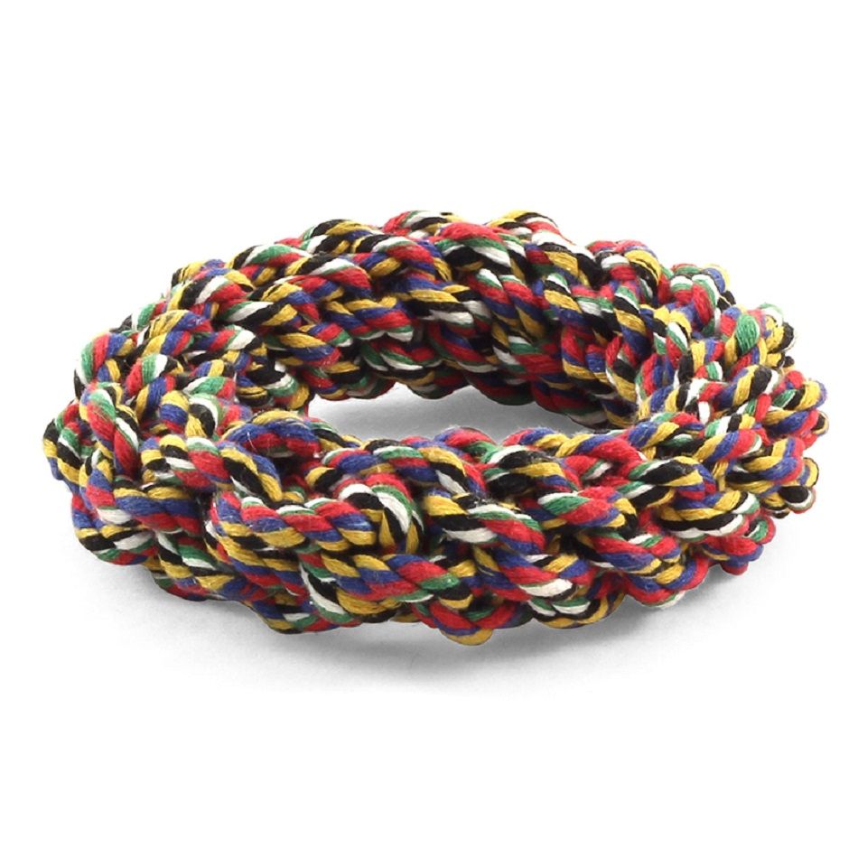 Плетеное кольцо сделано из разноцветных веревок из натурального хлопка, очень прочная игрушка. Способствует тренировке жевательных мышц у собаки. Цвет: разноцветный. Размер d115*30мм.