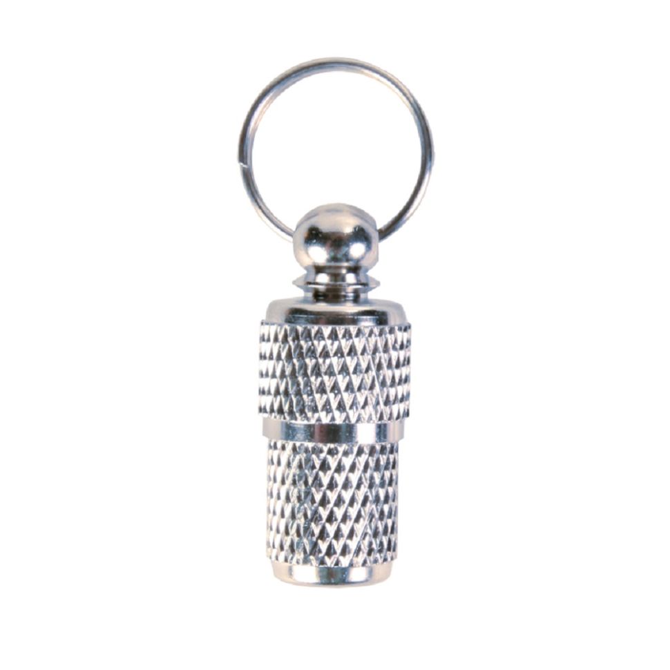 Адресник для собак, который подвешивается на ошейник с помощью кольца. Состоит из двух частей, которые соединяются между собак резьбой. Внутри вы можете разместить записку с вашими координатами (адрес, телефон или другими контактными данными). Это - необходимая мера для случаев, если вдруг собака убежит и потеряется. Адресник выполнен из металла с хромированным покрытием. Содержимое адресника защищено от пыли и грязи. Модель имеет маленький вес (до 8 грамм)