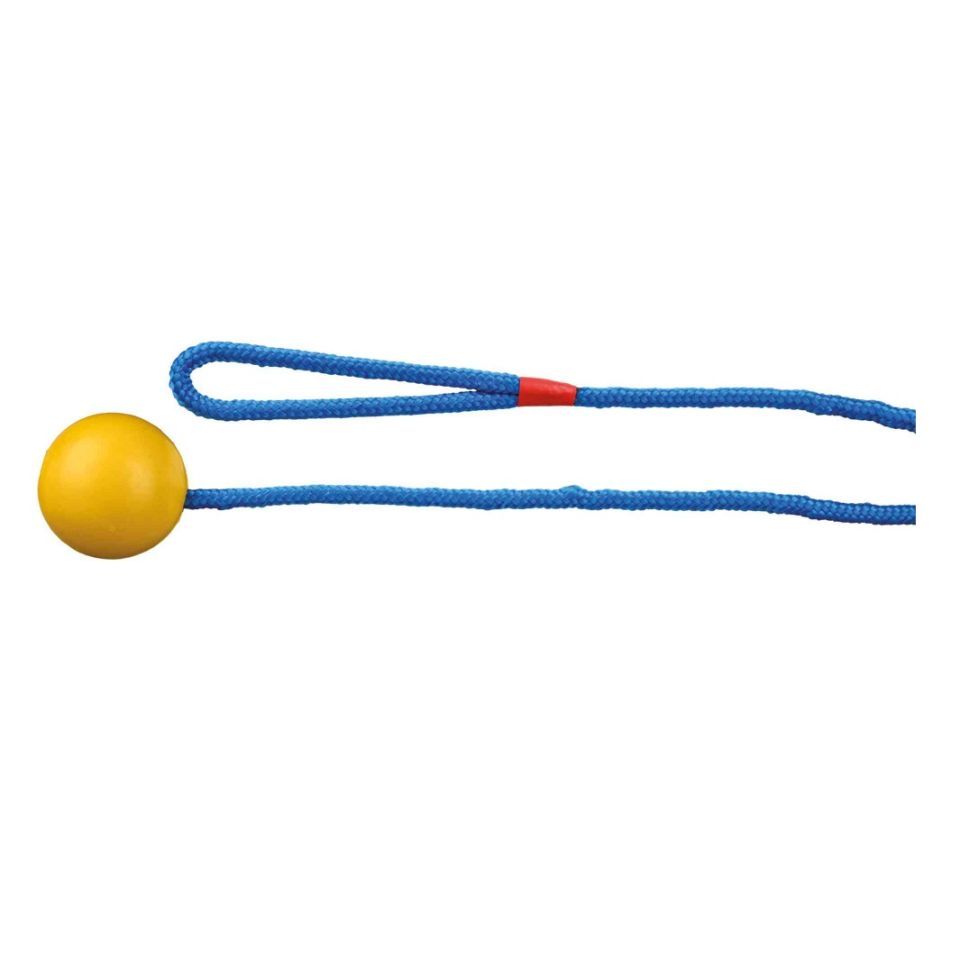 Мячик для активных игр с собакой. Выполнен из натурального каучука и имеет длинный нейлоновый шнур с ручкой в виде петли. Благодаря свойствам материала игрушка для собак обладает высокой эластичностью и прочностью. Поверхность мячика имеет маленькие эластичные шипы. В процессе игры собака хорошо развивает жевательные мышцы, а также мягко очищает десны и зубы от налета. Игрушку можно использовать для игр в перетягивание, потому что конструкция очень прочная.