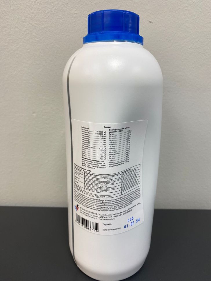 Витамины: витамин А — 22 950 000МЕ, витамин D3 — 9 000 000МЕ, витамин Е — 9900мг, витамин В1 — 1350мг, витамин В2 — 1125мг, витамин В6 — 1413мг, витамин В12 — 9мг, витамин К — 450мг, никотинамид — 2835мг, кальция пантотенат — 4725мг, цинк — 1170мг, медь — 1035мг, магний — 99мг, селен — 40,5.