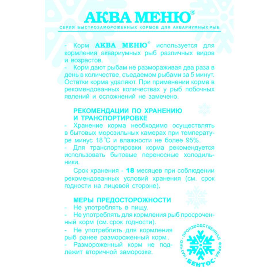 Рекомендации, дозировка | Корм дают рыбам не размораживая в количестве, съедаемом рыбами за 5 минут, остатки корма удаляют |