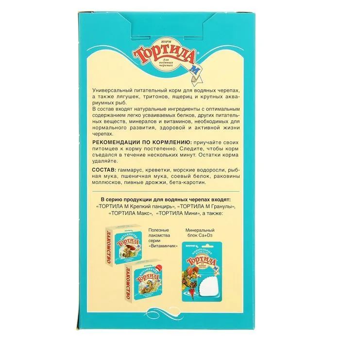 Универсальный питательный корм для водяных черепах, а также лягушек, тритонов, ящериц и крупных аквариумных рыб.
